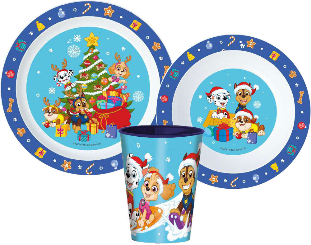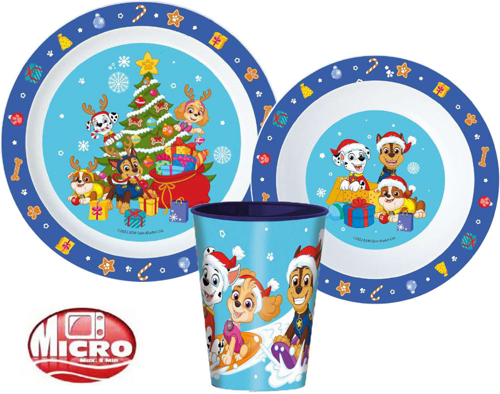 Mancs Őrjárat Holiday Karácsonyi étkészlet, micro műanyag szett, pohárral 260 ml